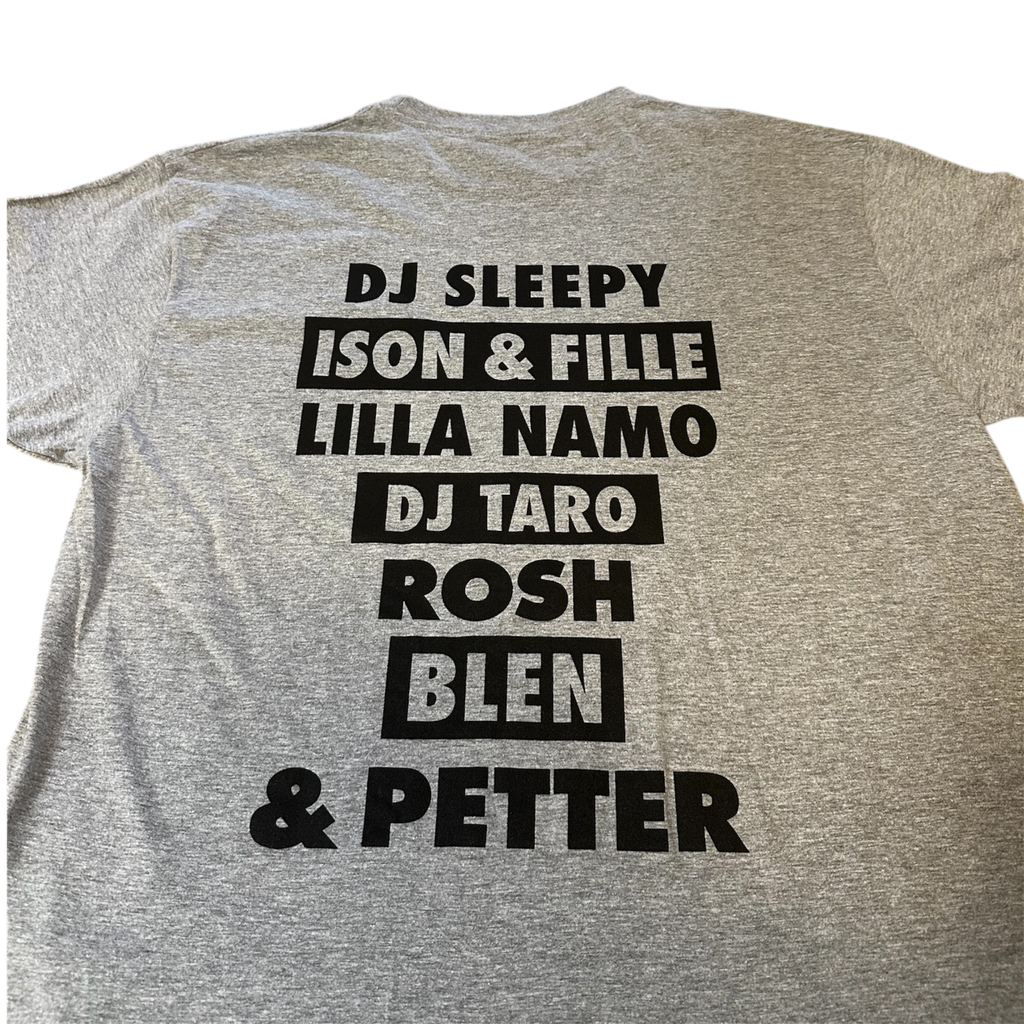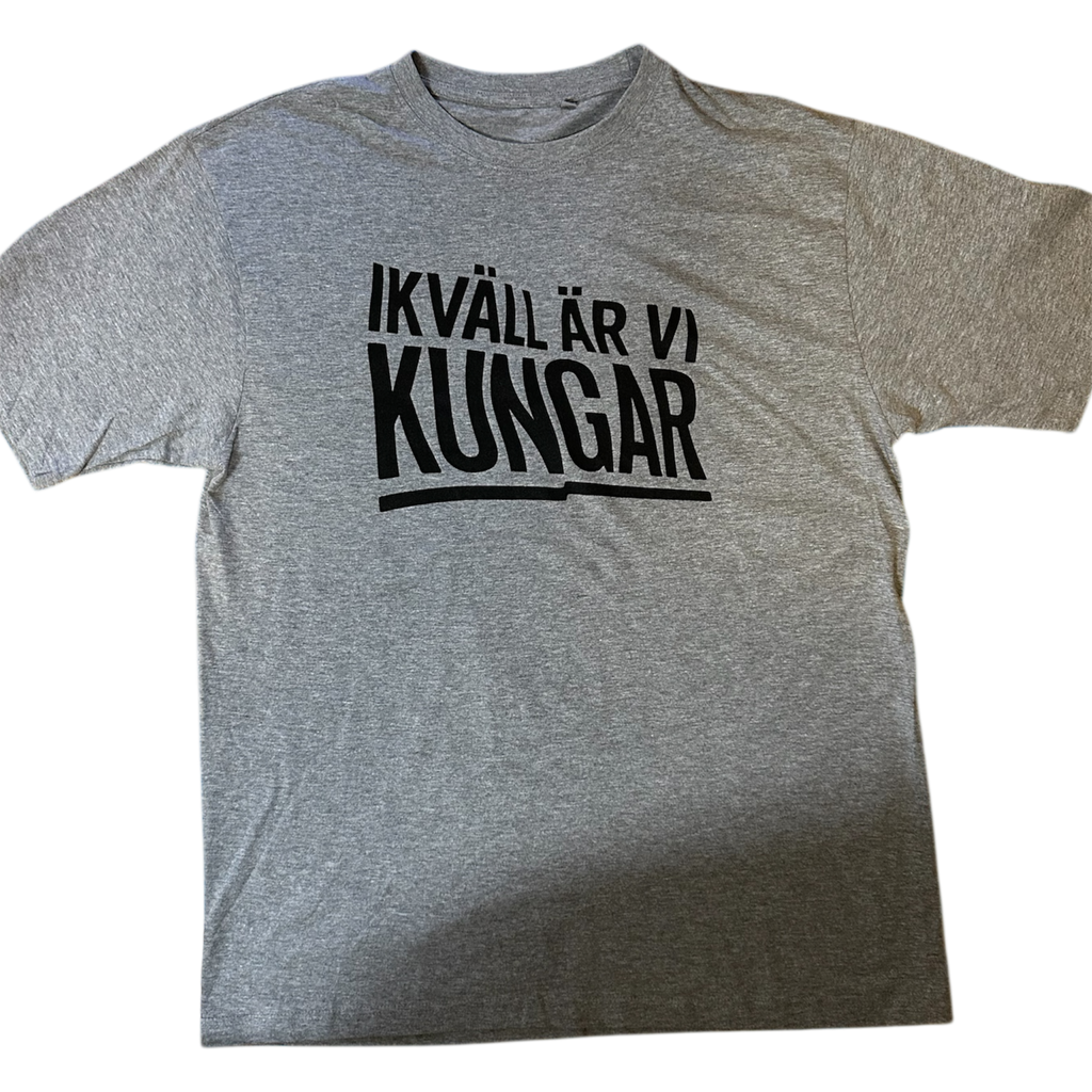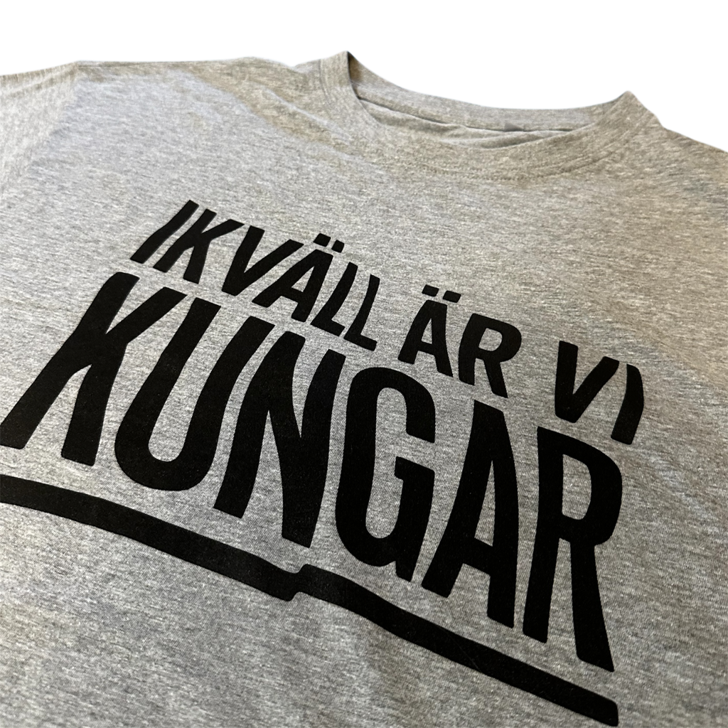 Grå T-shirt från kollektionen Ikväll är vi kungar med stort tryck på bröstet och ett tryck på ryggen.