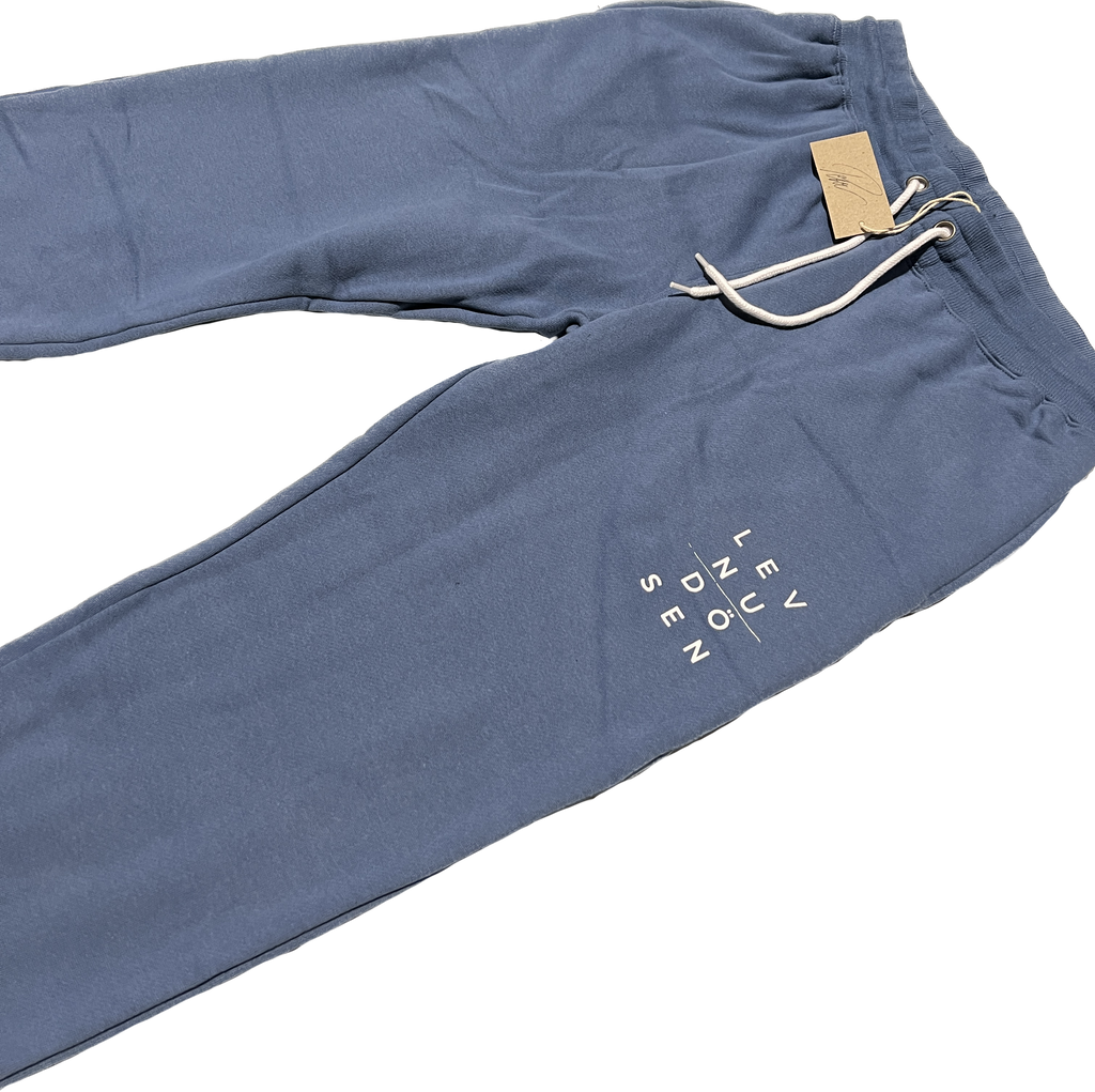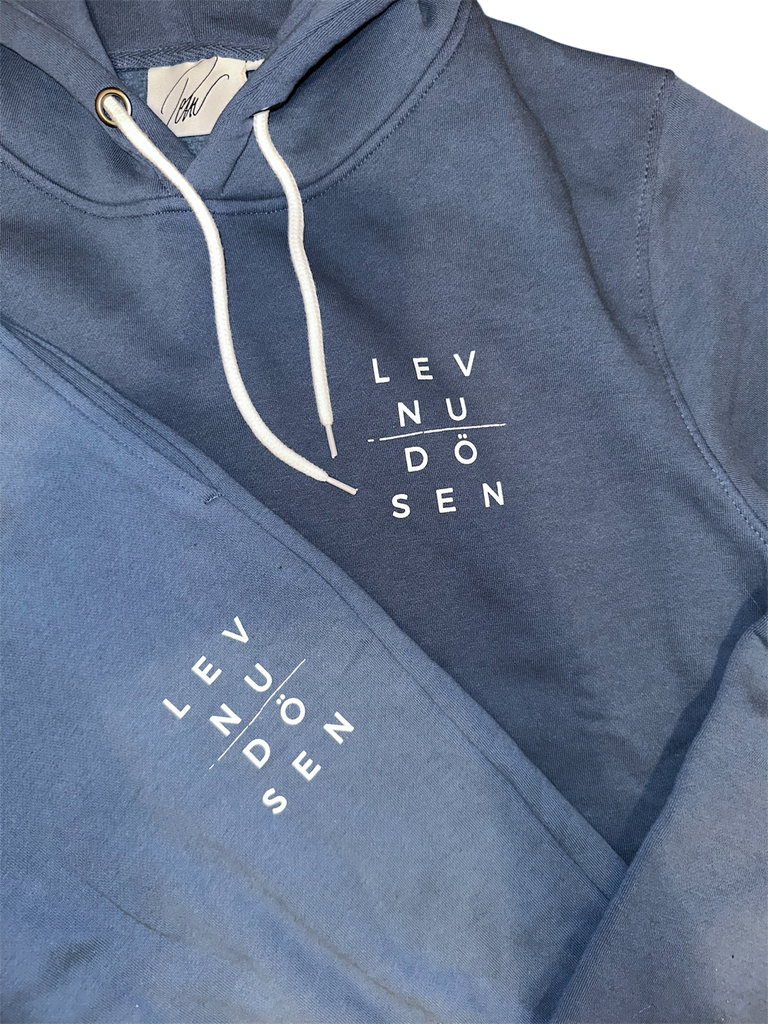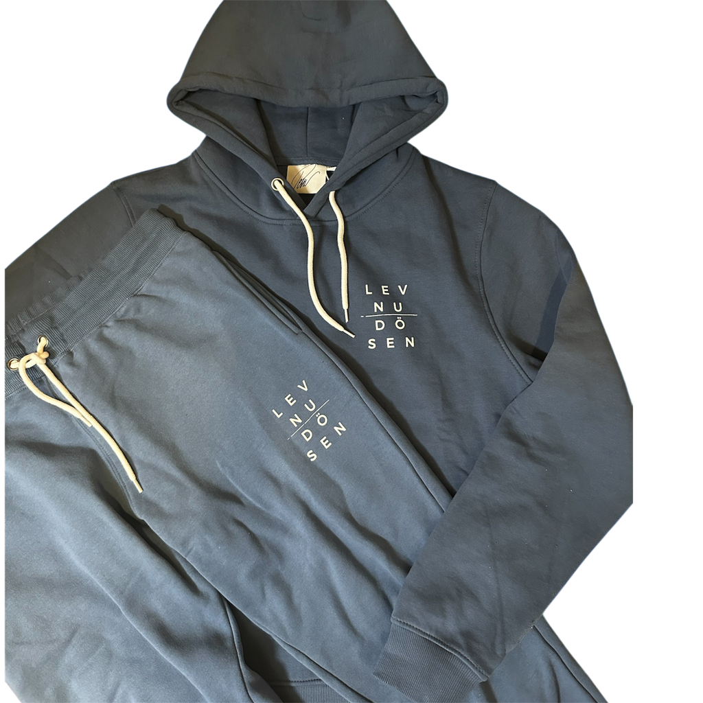 Blå mjukidsdress med lev nu dö sen printat på framsidan.
