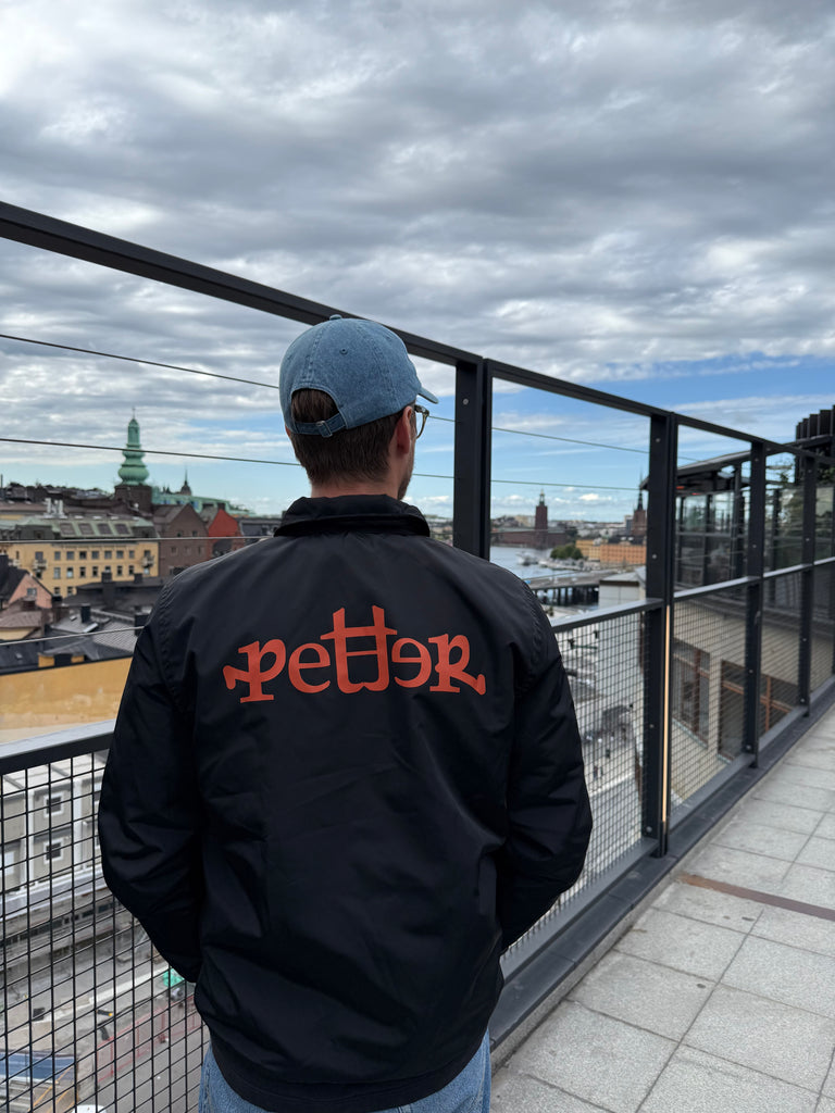 Svart jacka i nylonmaterial med Mitt sjätte sinne-tryck i orange på bröst och rygg. Jackan har fickor och dragsko nedtill. Unisexmodell.
