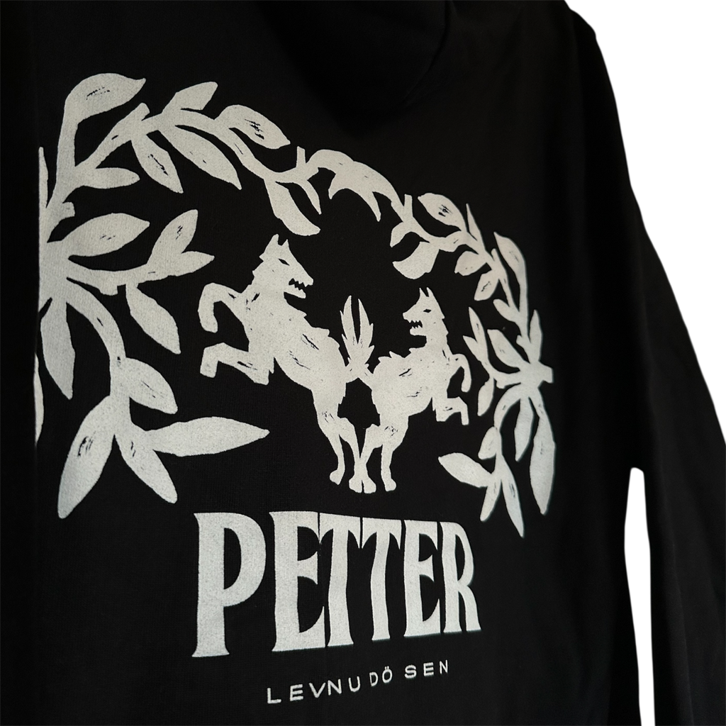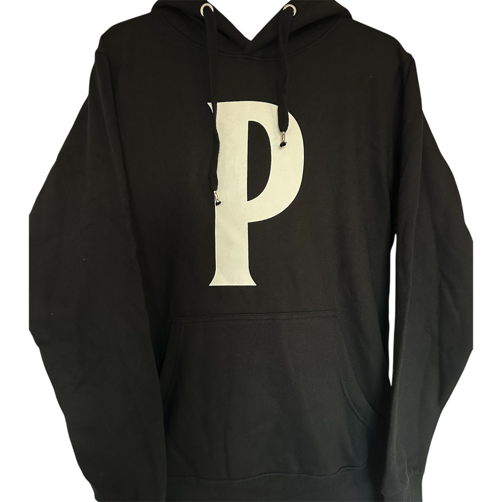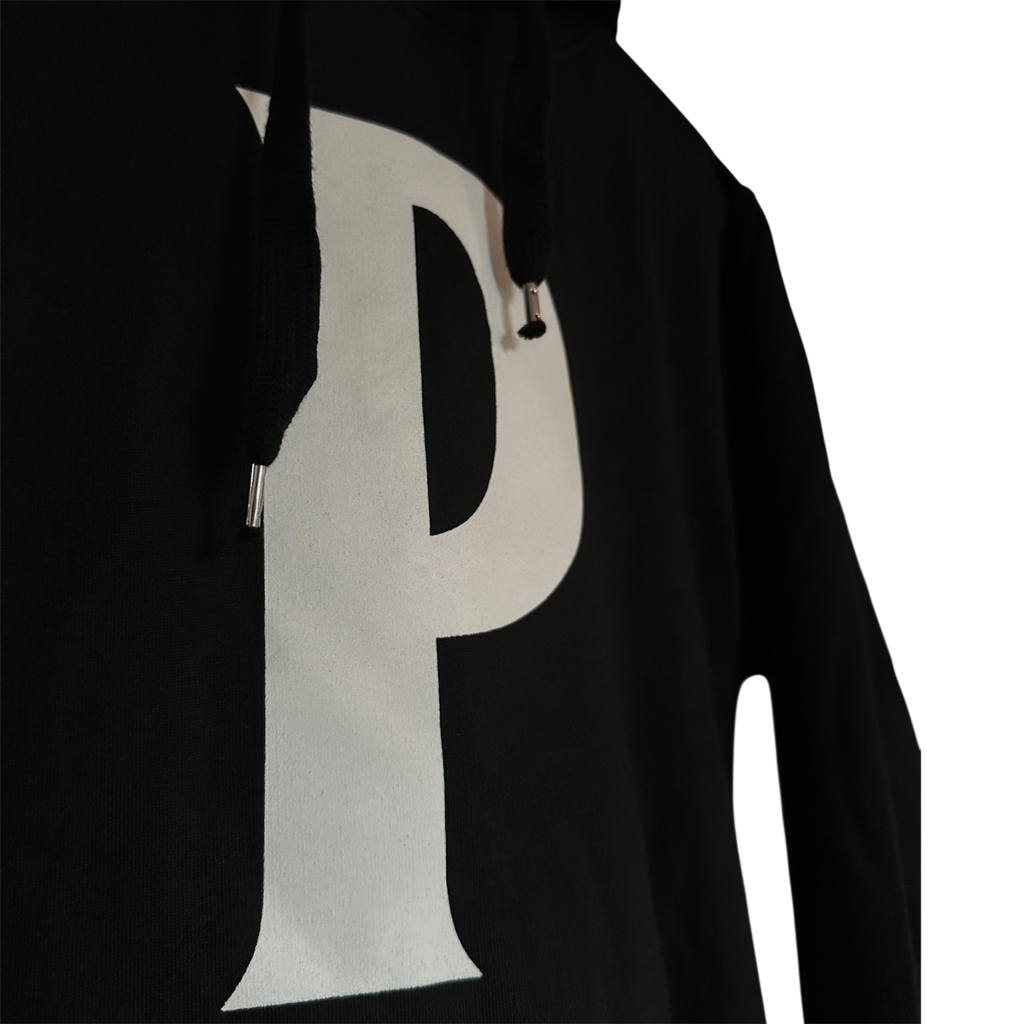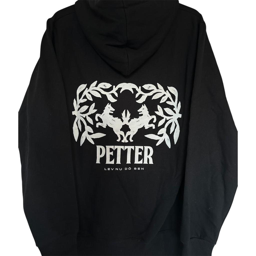 Svart hoodie med ”Lev nu dö sen”-text och grafik på ryggen och en stilren P-logga på bröstet.