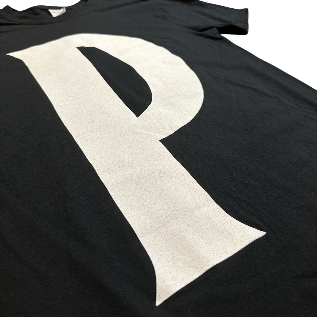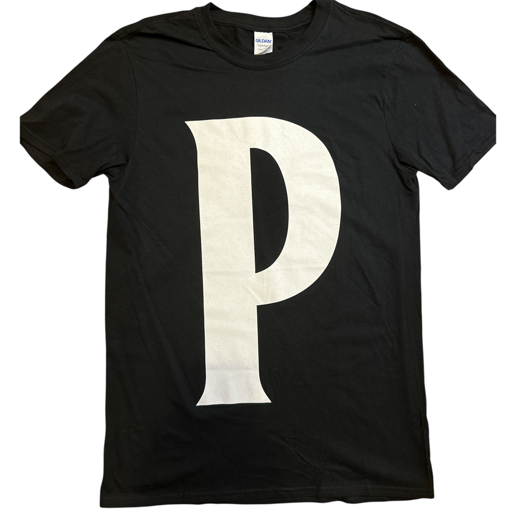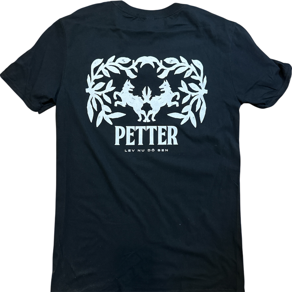 Svart T-shirt med ”Lev nu dö sen”-text och grafik på ryggen och en stilren P-logga på bröstet.